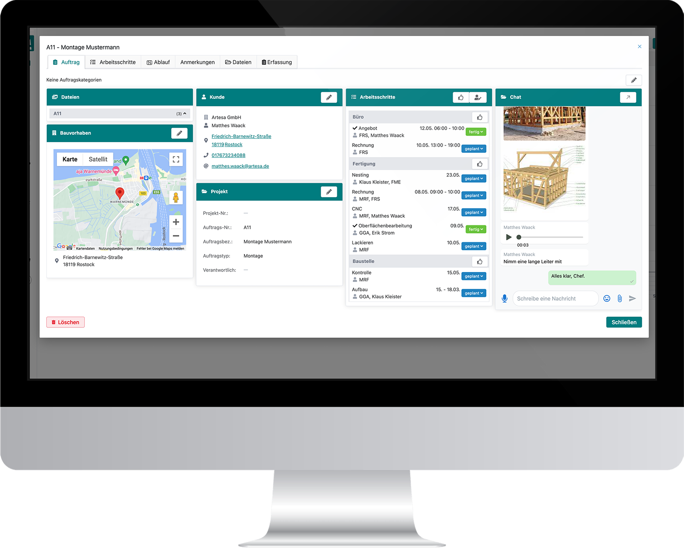 Das kann dir mit Artesa nicht passieren! Alle Informationen an einem Ort. Auf der Baustelle wird dir der Chat in der Auftragsakte mit allen vorherigen Nachrichten angezeigt.