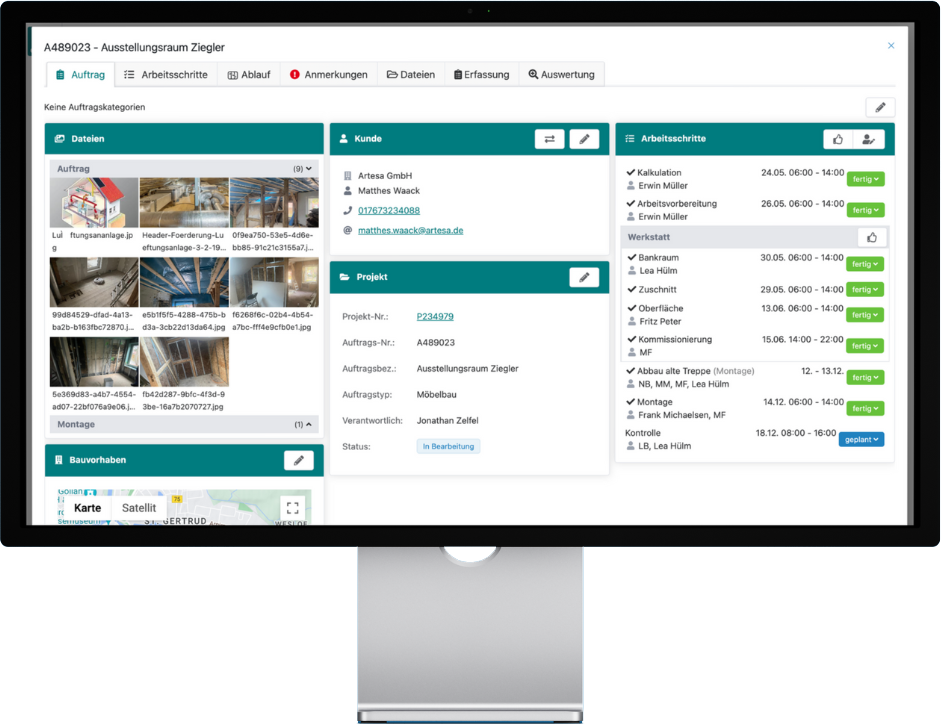 Ein großer Vorteil von Artesa ist außerdem, dass es die Einstellung gibt, Arbeitsschritte und Projekte nur dann abschließen zu können, wenn eine gewisse Anzahl an Fotos gemacht wurde. Die Bilder werden dann in der digitalen Auftragsakte gespeichert, sodass sie jederzeit und von überall auf jedem Gerät abgerufen werden können.