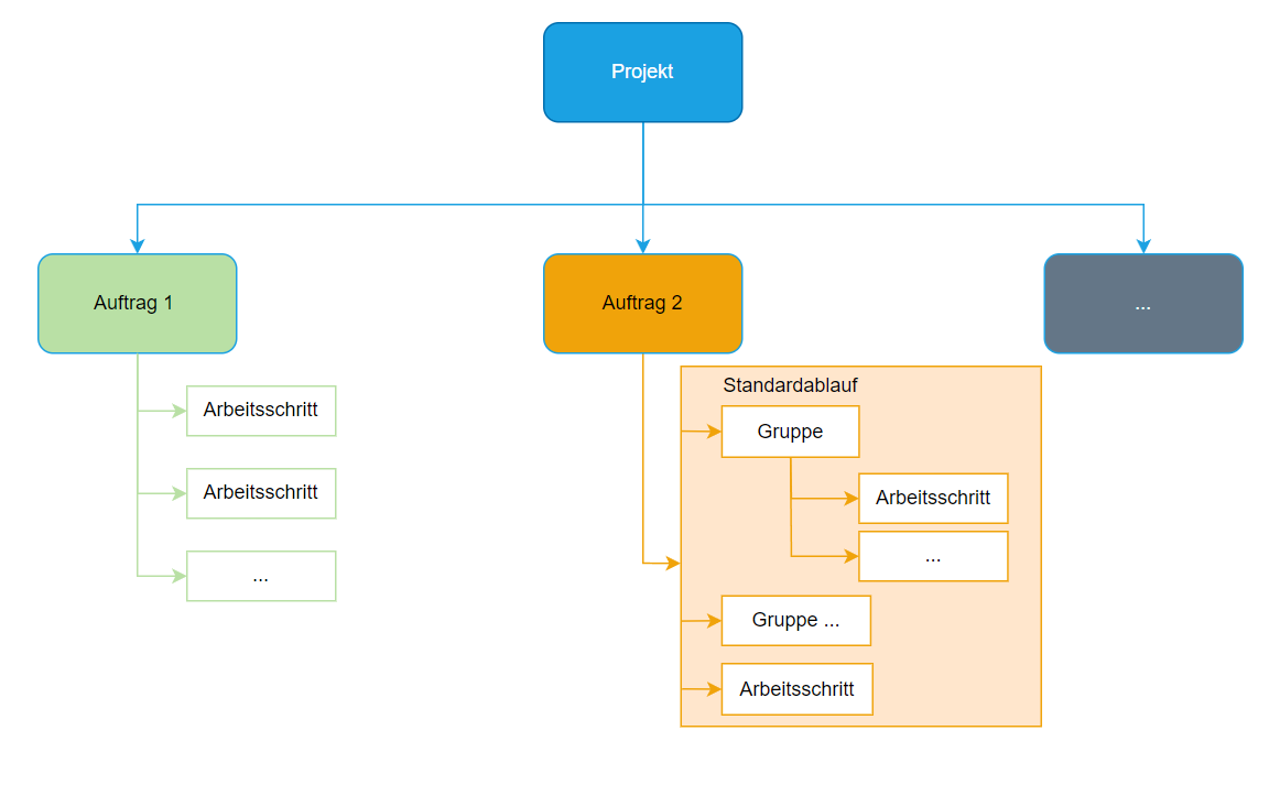 Du hast ein Projek. Ein Projekt kann mehrere Aufträge haben. Zu jedem Auftrag gehören Arbeitsschritte.
