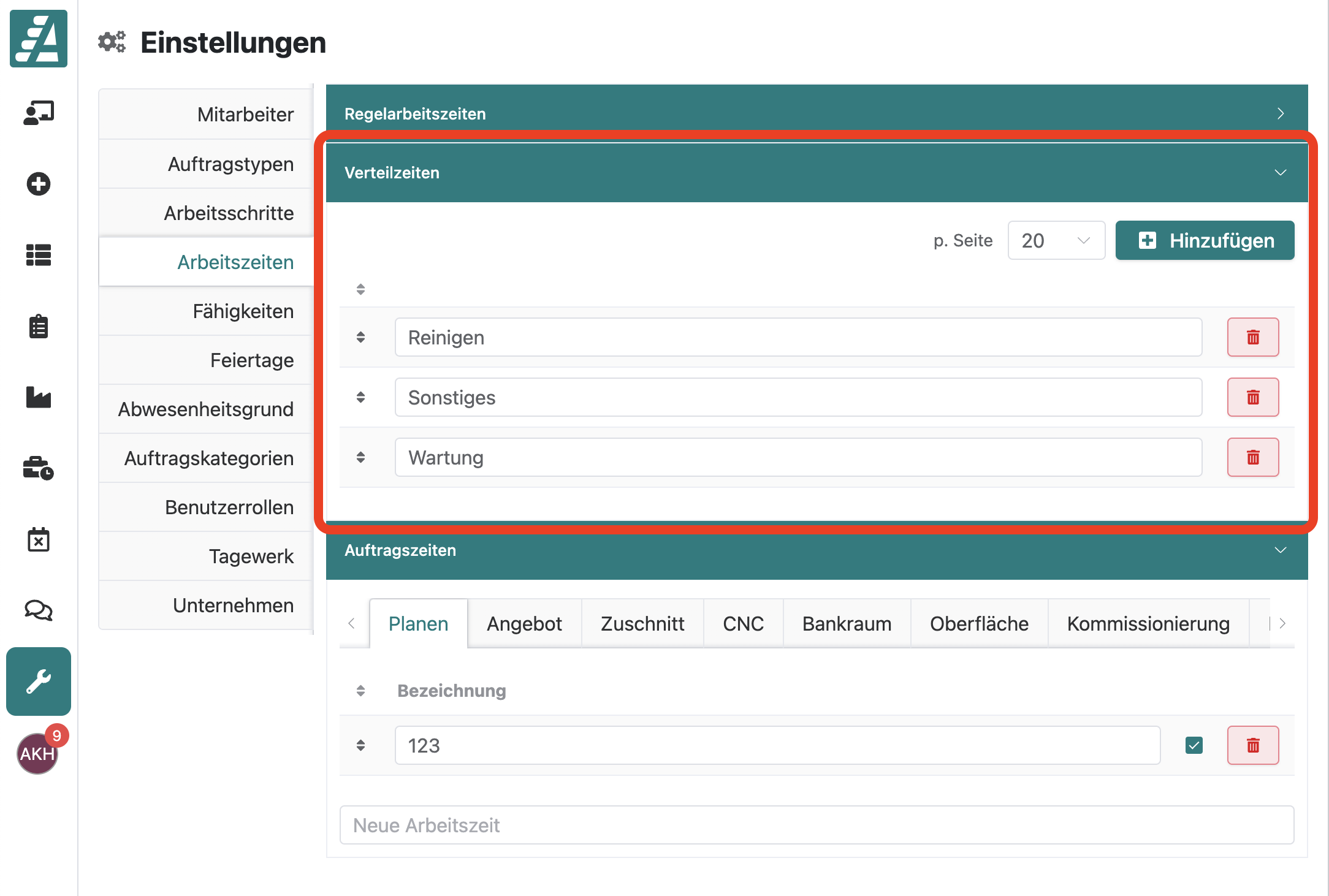Verteilzeiten können in den Einstellungen angelegt werden. Sie sind eine Art Auftrag, der nicht auf einen Kunden gebucht wird, sondern auf einen Mitarbeiter. So können Zeiten gebucht werden, die nicht direkt einem Auftrag zugeordnet werden können. Das können bspw. Wartungsarbeiten sein.